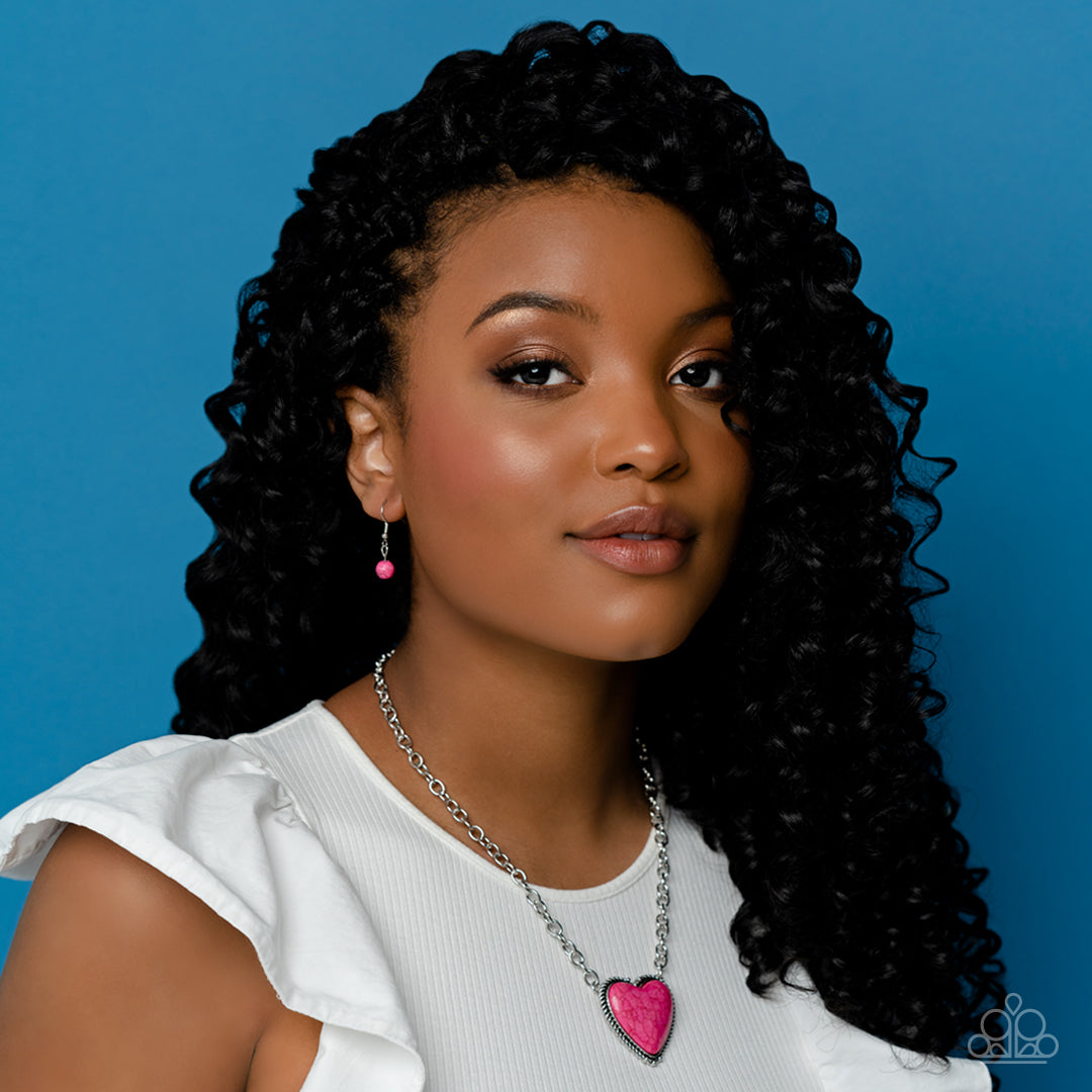 Dangling from the bottom of a thick silver chain, an oversized, hot pink stone is pressed into a textured, studded, silver heart frame for some southwestern sass. Features an adjustable clasp closure. As the stone elements in this piece are natural, some color variation is normal.