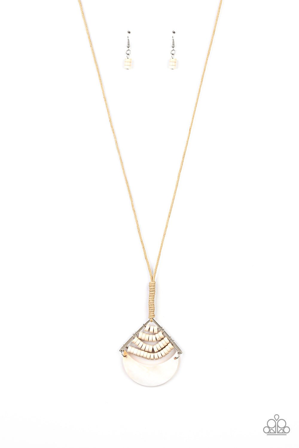 Threaded along dainty wires, rows of round white beads give way to a shell-like half moon pendant at the bottom of an angled silver frame. The beach inspired pendant is knotted in place at the bottom of a lengthened cord for a seasonal flair. Features an adjustable clasp closure.