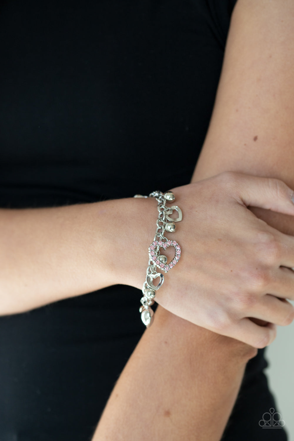 Infused with classic silver beads, a flirty collection of silver heart charms and heart shaped frames dangle from the wrist. A pink rhinestone encrusted frame tops off the charming look with a dazzling splash of shimmer. Features an adjustable clasp closure.