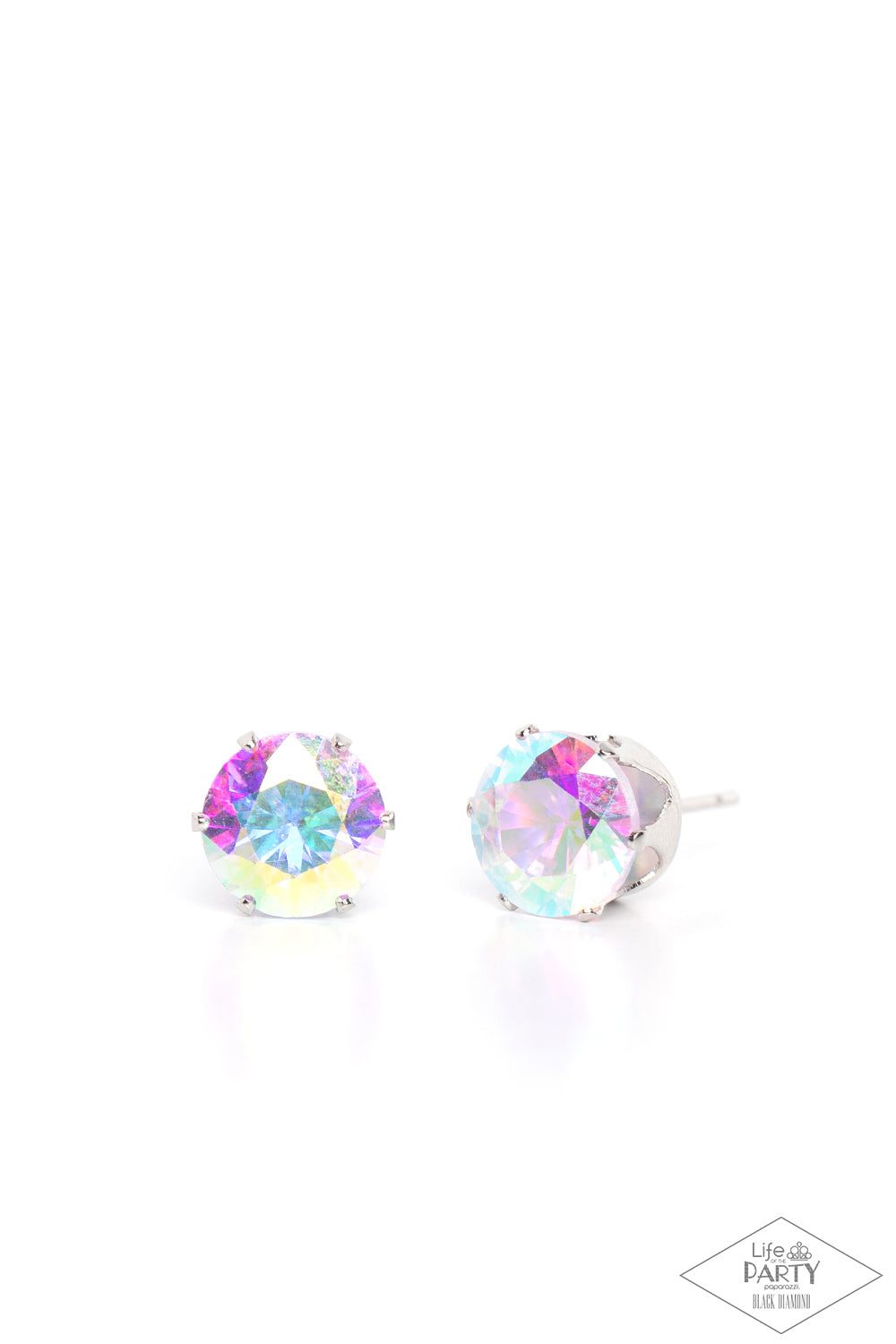 A glassy iridescent rhinestone is nestled inside of a shimmery silver frame for a timeless look. Earring attaches to a standard post fitting. Due to its prismatic palette, color may vary.