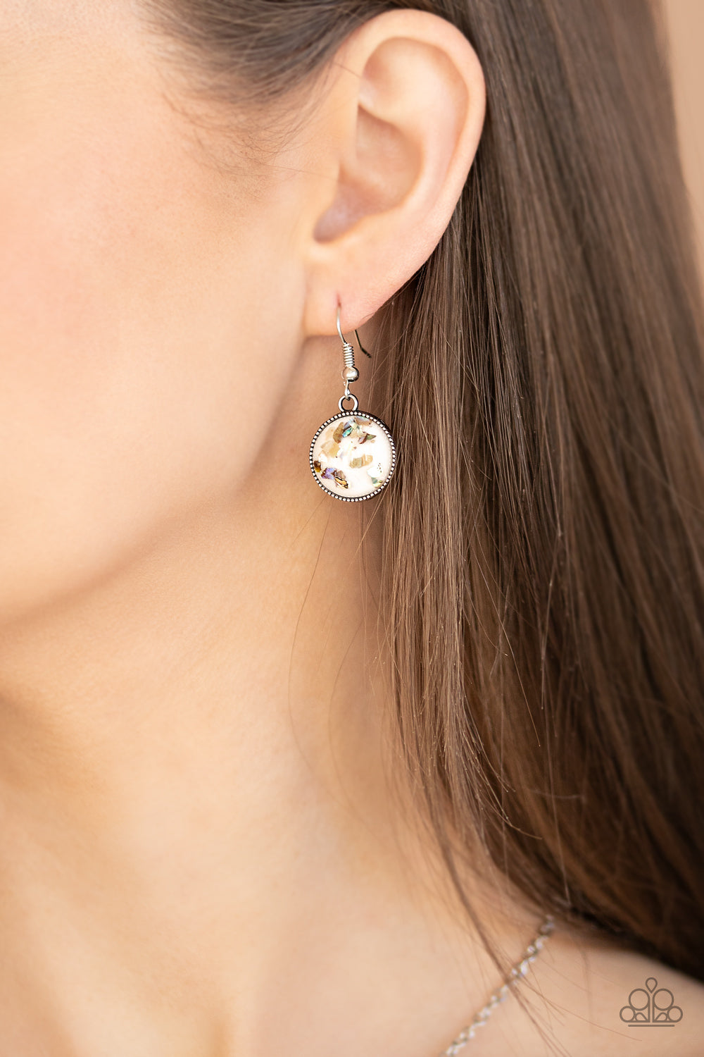 Featuring flecks of iridescent shell-like accents, four glassy white beads stack into a dazzling pendant at the bottom of a shimmery silver chain for an effervescent look. Features an adjustable clasp closure.
