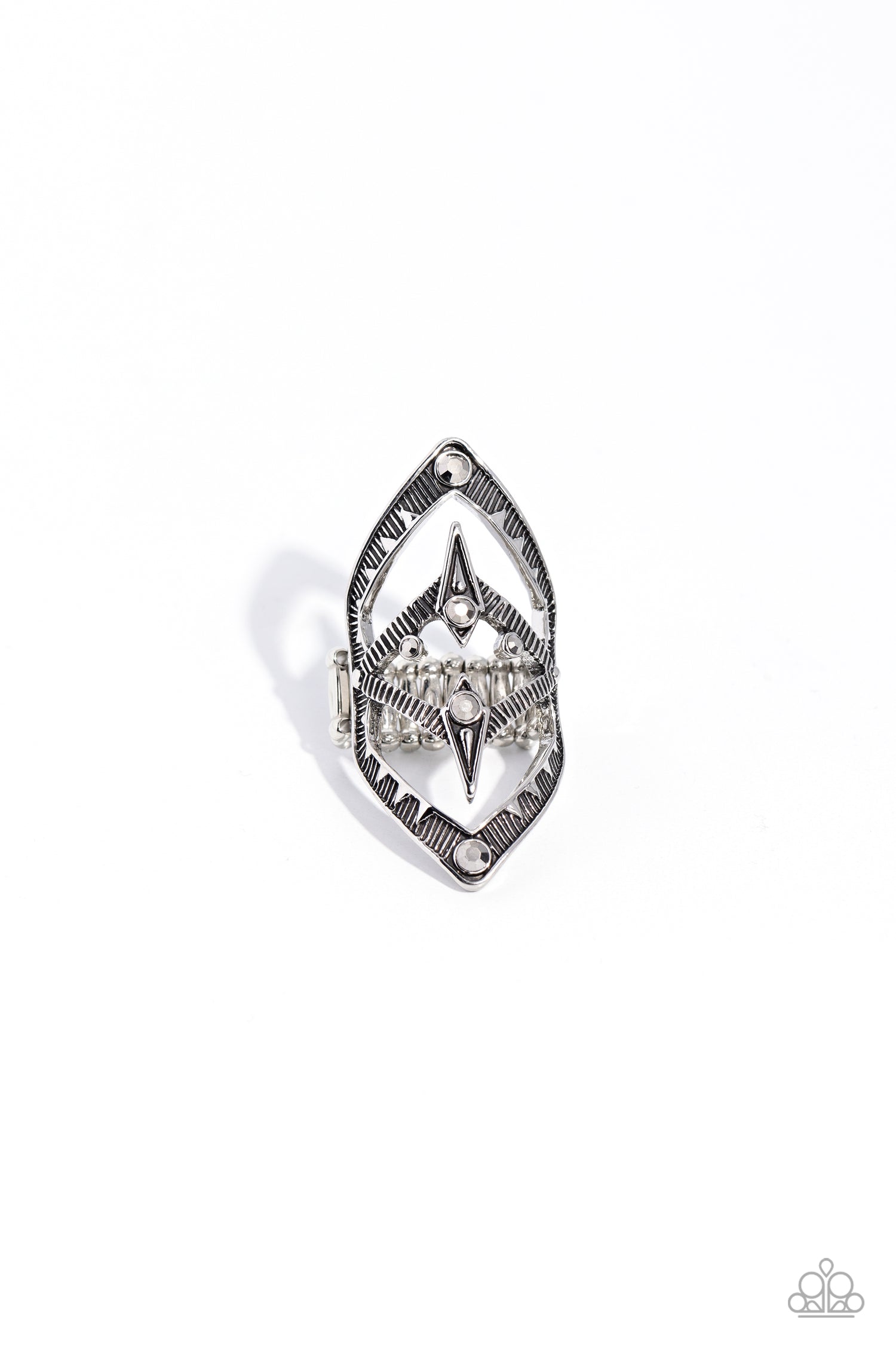 A pair of hematite-spotted, textured, airy, silver diamond-shaped frames arc up the finger, culminating into an edgy centerpiece. Features a stretchy band for a flexible fit.