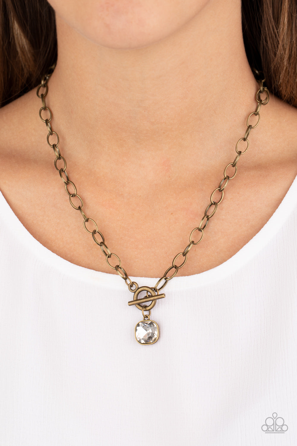 Pressed into a sleek brass frame, a dramatic white gem swings from the bottom of a glistening brass chain below the collar for a chic look. Features a toggle closure.