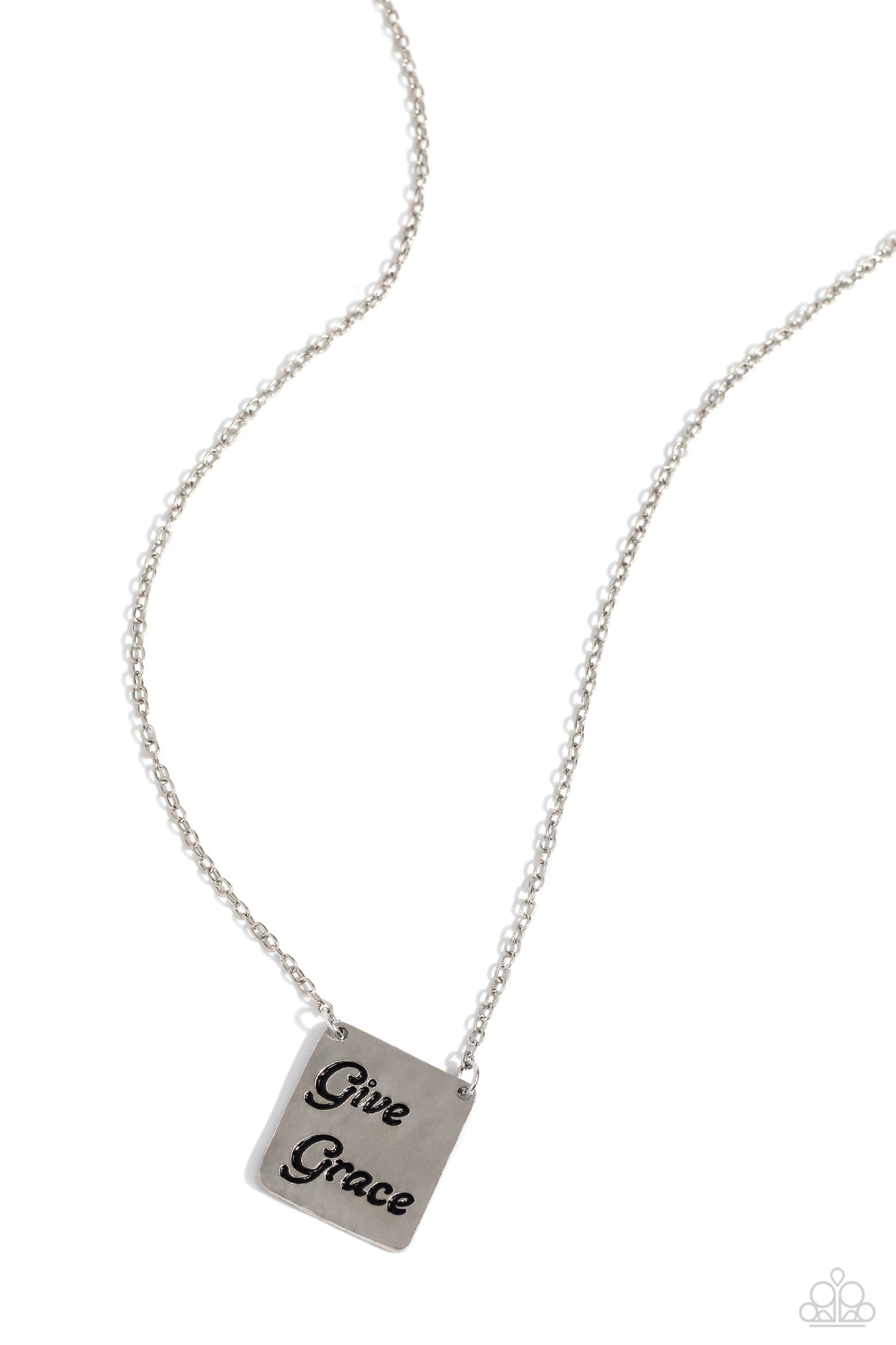 Cascading from a dainty silver chain, a lightly-hammered silver square pendant is stamped with the cursive phrase "Give Grace" for an inspirational statement. Features an adjustable clasp closure.