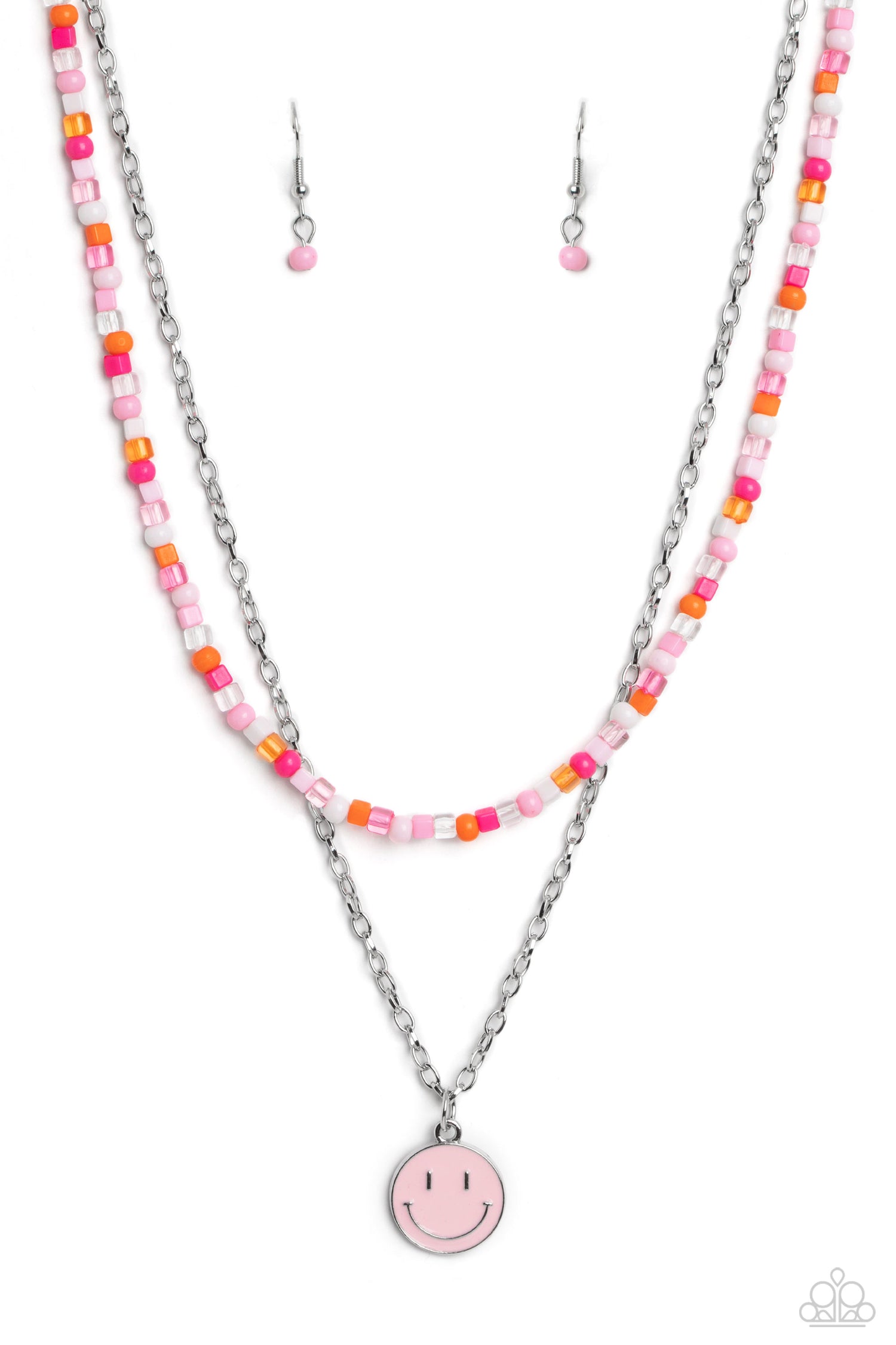 Gliding from a dainty, silver chain, a smiley face pendant stands out against a pink backdrop. Completing the charismatic ensemble, a collection of seed beads in shades of light pink, white, pink, orange, and hot pink create bright pops of color around the neckline for a youthful finish. Features an adjustable clasp closure.