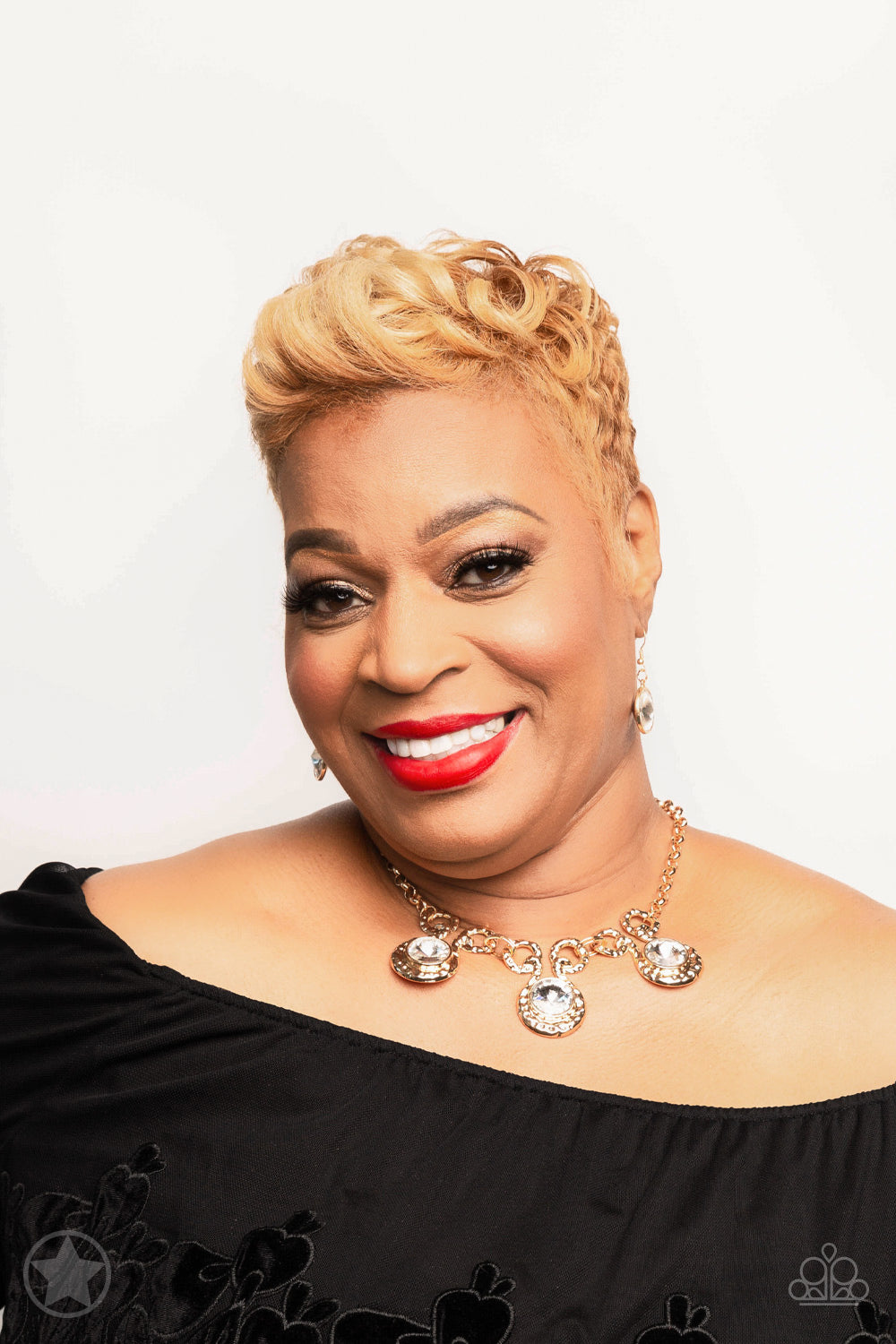 Three dramatically oversized rhinestones are nestled into three textured gold fittings that are connected by oval gold rings, creating a brilliant statement piece. Features an adjustable clasp closure.