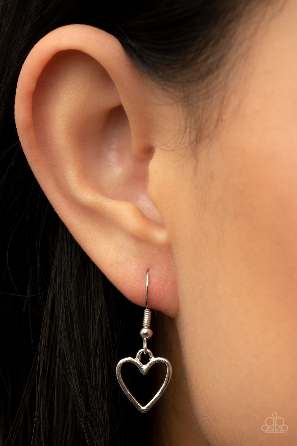 A pair of shiny silver and Pale Rosette hearts asymmetrically adorn sections of mismatched silver chain, resulting in a flirtatious pop of color below the collar. Features an adjustable clasp closure.