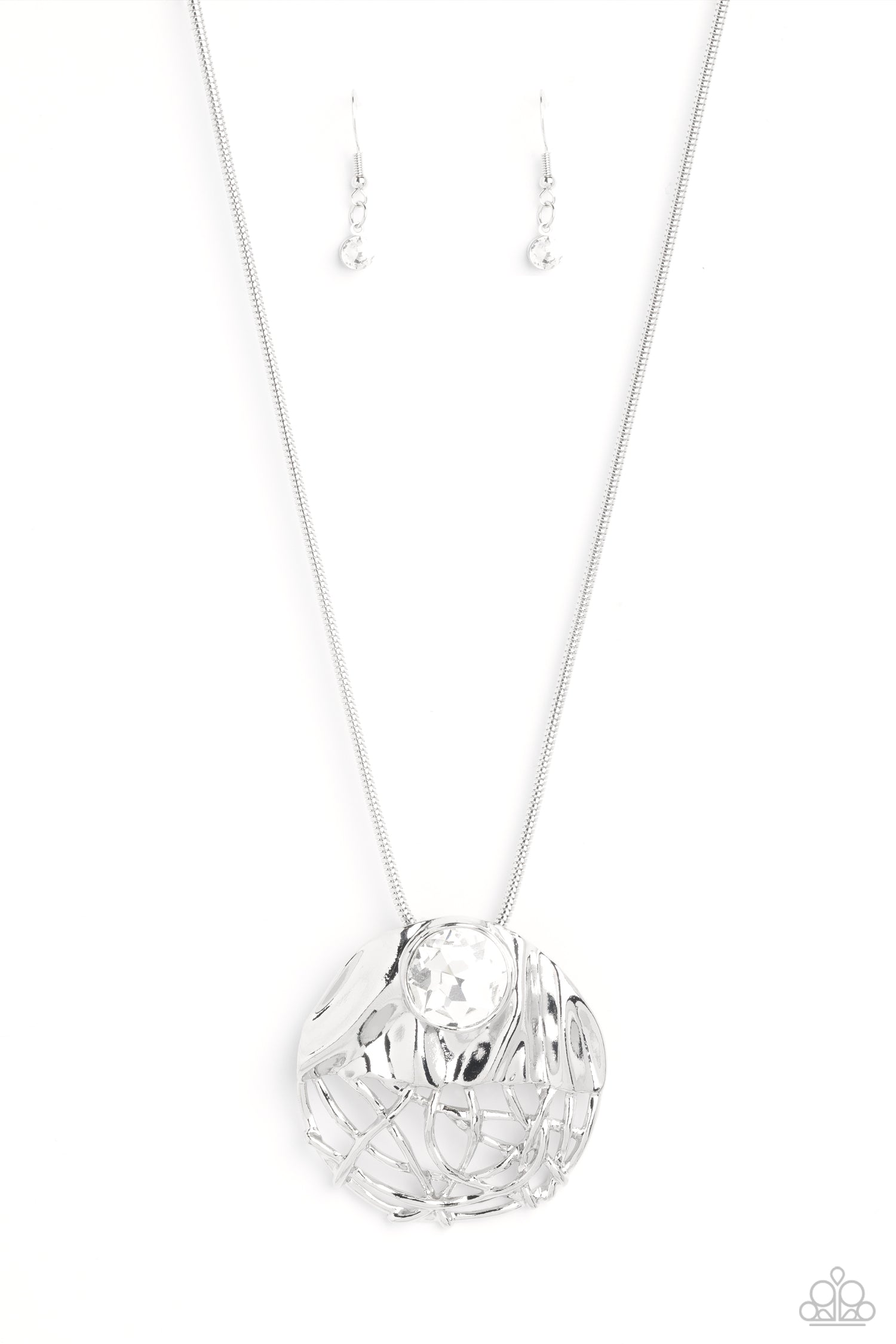 Mimicking a lattice-like pattern, abstract silver lines flow from the bottom of an oversized, hammered, silver half-circle pendant that attaches to a shimmery silver snake chain. Within the folds of the silver half-circle, an oversized, faceted white gem stands out against the chest for a fashionable pop of color. Features an adjustable clasp closure.