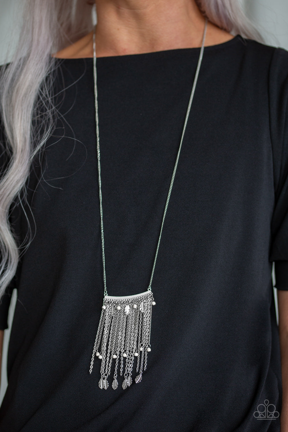 Attached to a lengthened silver chain, a hammered silver bar gives way to a fringe of shimmery silver chain, white stone beads, and silver feather frames for a seasonal look. Features an adjustable clasp closure.