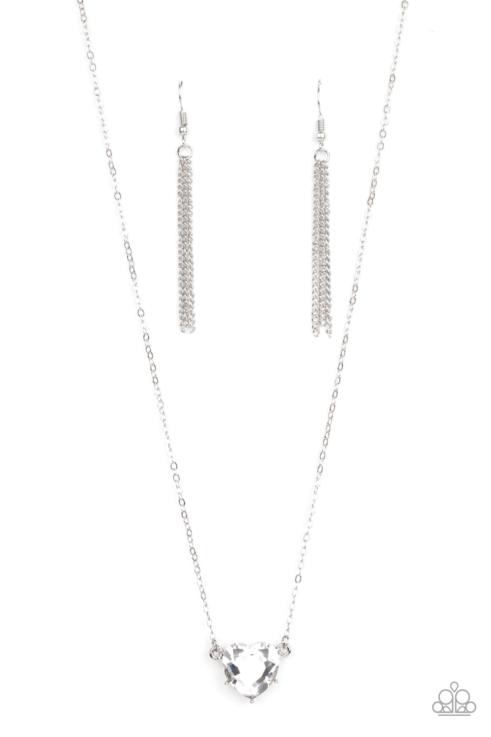 Cut into a flirtatious heart shape, a dramatically oversized white rhinestone pendant swings from the bottom of a dainty silver chain below the collar for a glamorous finish. Features an adjustable clasp closure.