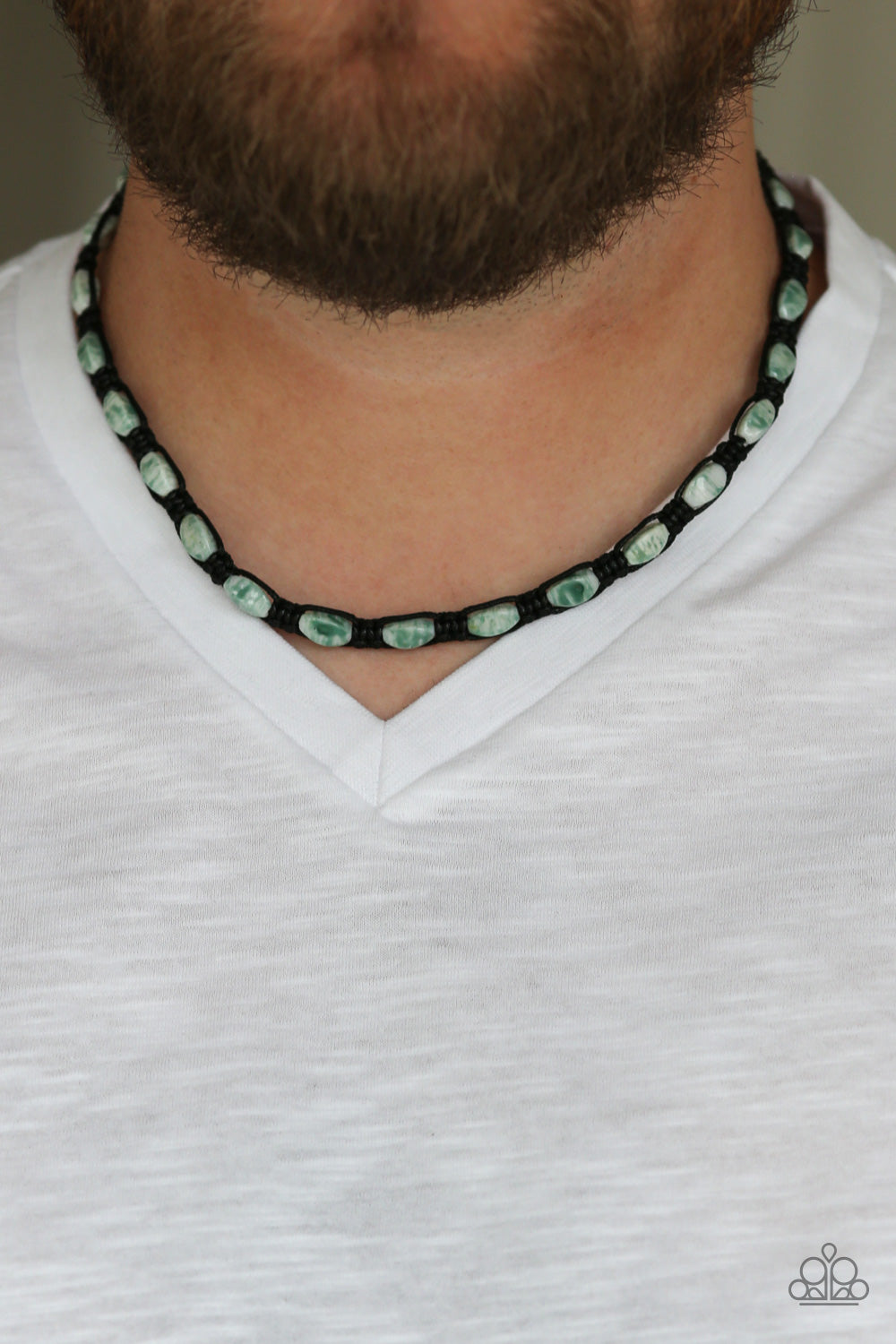 Glassy green stones are knotted in place along a braided black cord below the collar for a seasonal look. Features a button loop closure.