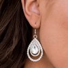 An oversized white teardrop gem is nestled inside two expansive teardrop frames encrusted in dainty white rhinestones, creating a rippling radiance. Earring attaches to a standard fishhook fitting.