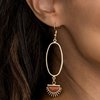 A golden sunburst charm with a goldstone center dangles from the bottom of an elongated oval hoop for a trendy vibe. Earring attaches to a standard fishhook fitting.