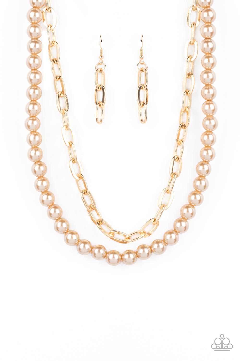 A string of classic pearls in a soft, brown hue is layered with a strand of oversized gold links, creating a gorgeous collision of refinement and grit as they lay along the collar. Features an adjustable clasp closure.