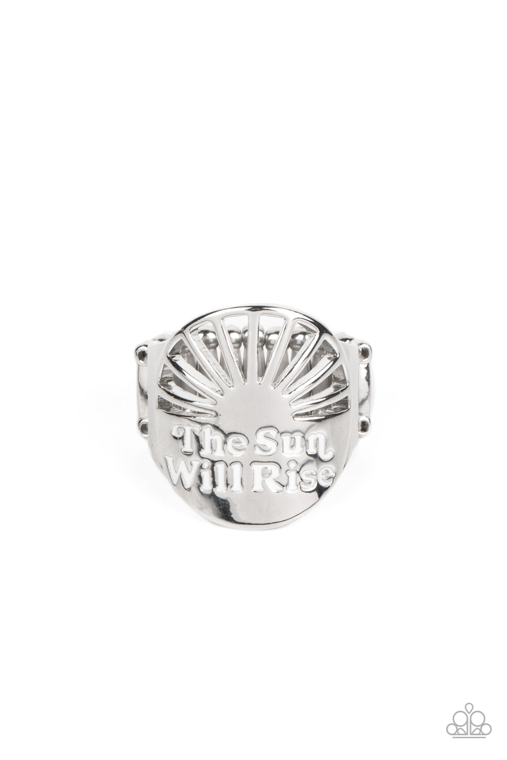 An oval band of silver is stamped with the phrase "The Sun Will Rise" with white paint outlining the inspirational message. A sun rises above the words with its rays cut out in airy stripes, adding a touch of texture. Features a stretchy band for a flexible fit.