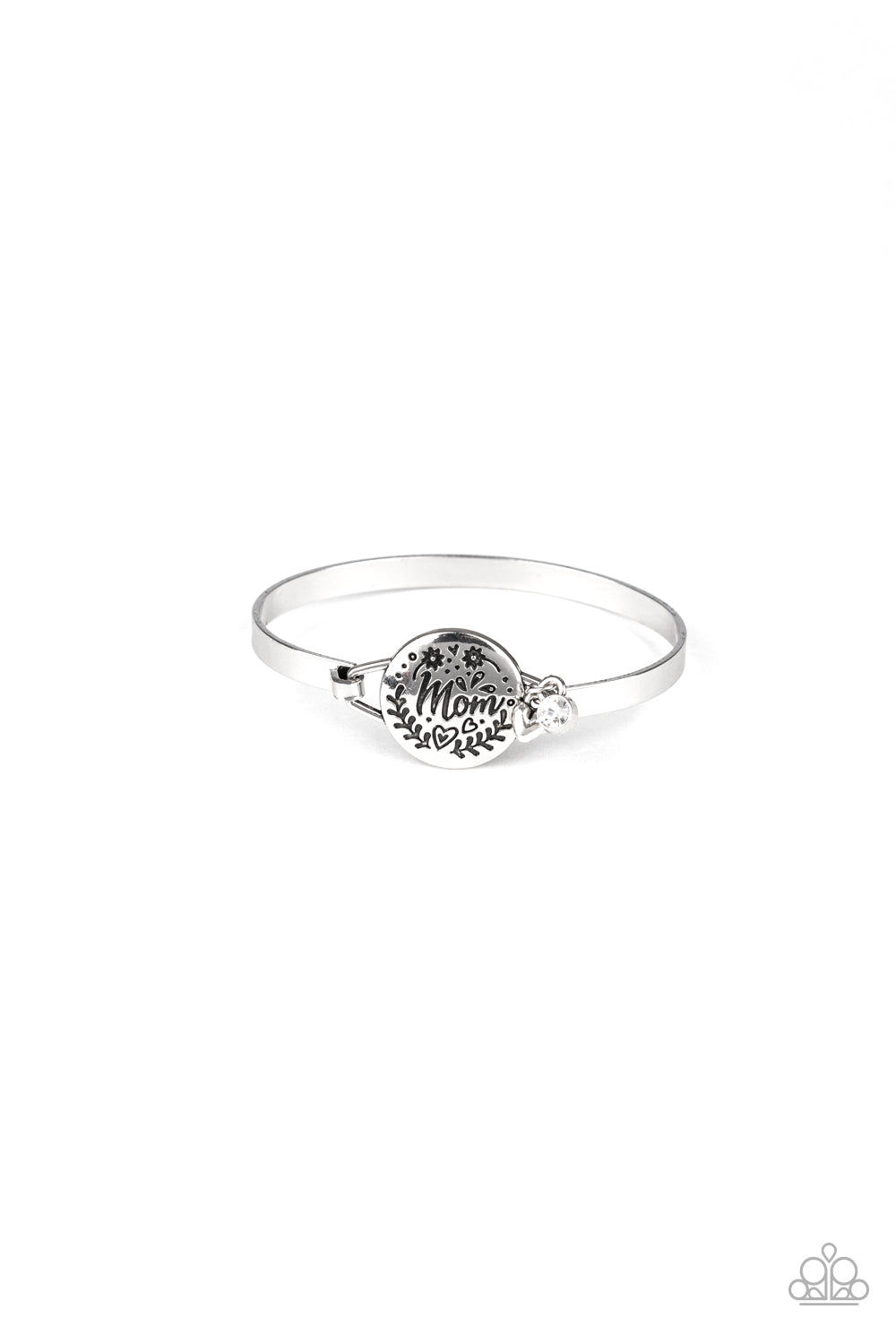 Stamped in floral patterns and the word, "Mom", a shiny silver disc joins a dainty white and glistening silver heart charm at the center of the wrist, creating a whimsical cuff-like bangle. Features a hinged closure.
