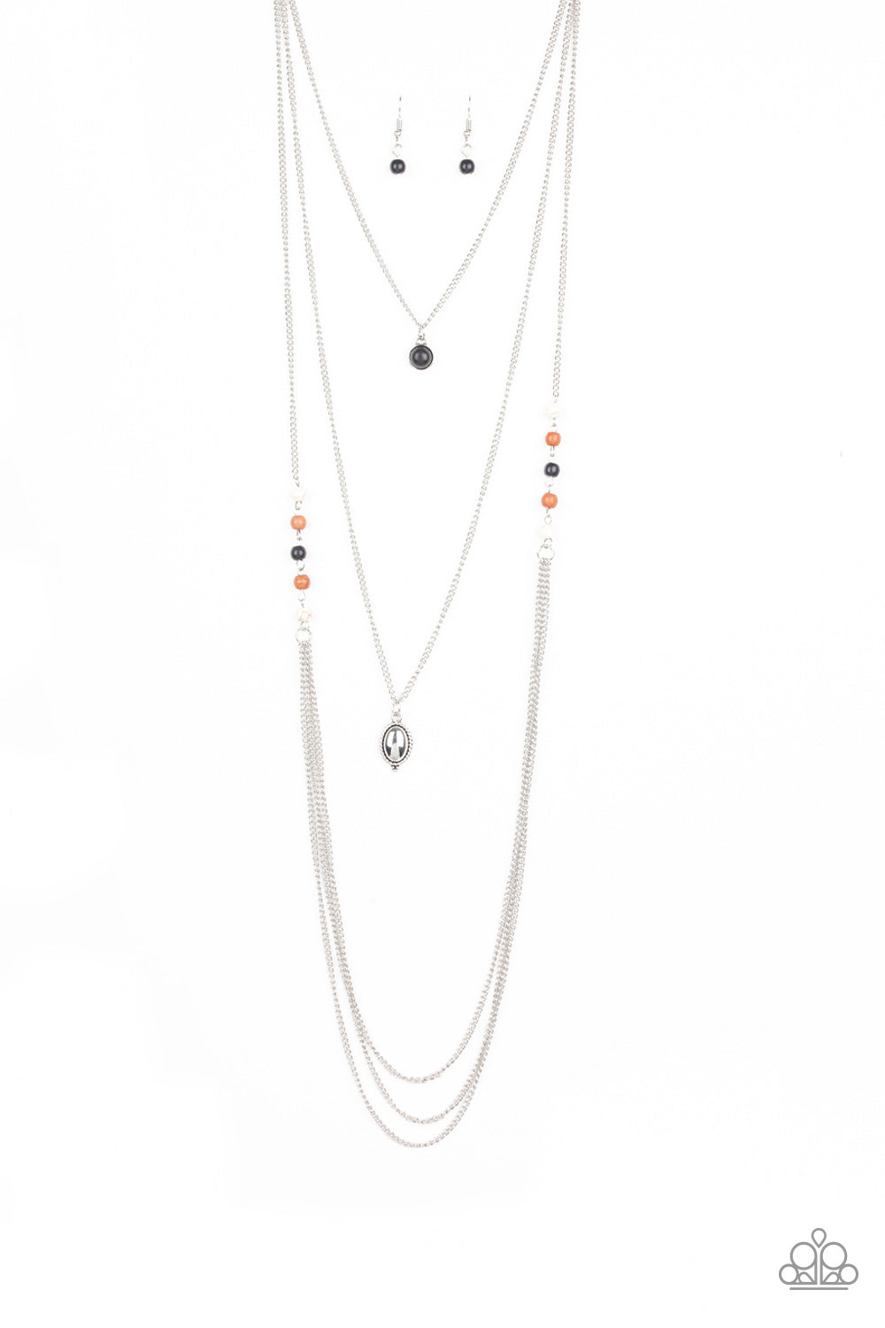 Multicolored stone beads give way to layers of shimmery silver chain down the chest. A black stone pendant and shiny silver frame drape above the cascade of silver chains for a seasonal flair. Features an adjustable clasp closure.
