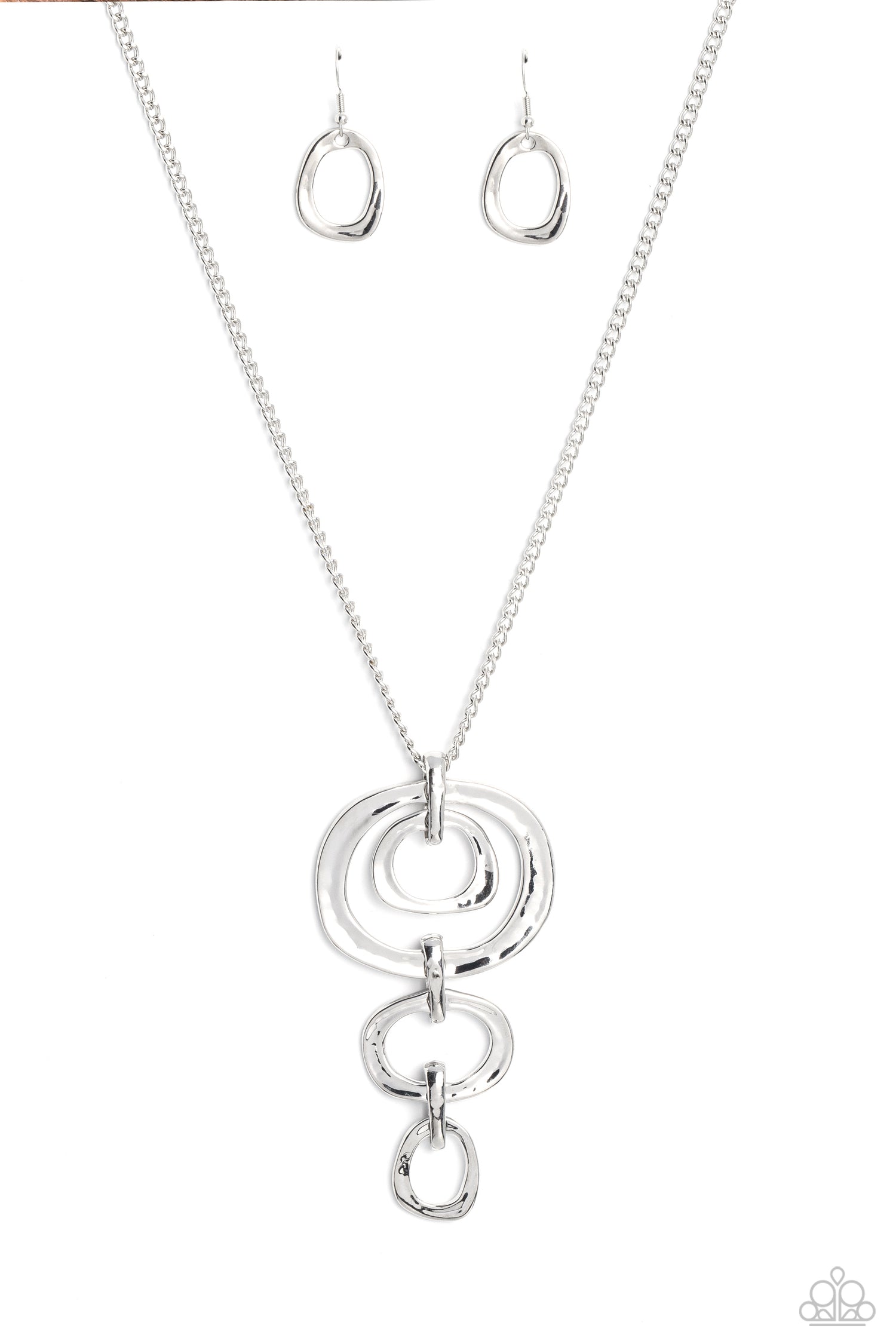 Trickling down the chest from an elongated silver chain, a mismatched assortment of hammered silver abstract rings glistens in this monochromatic masterpiece. Features an adjustable clasp closure.