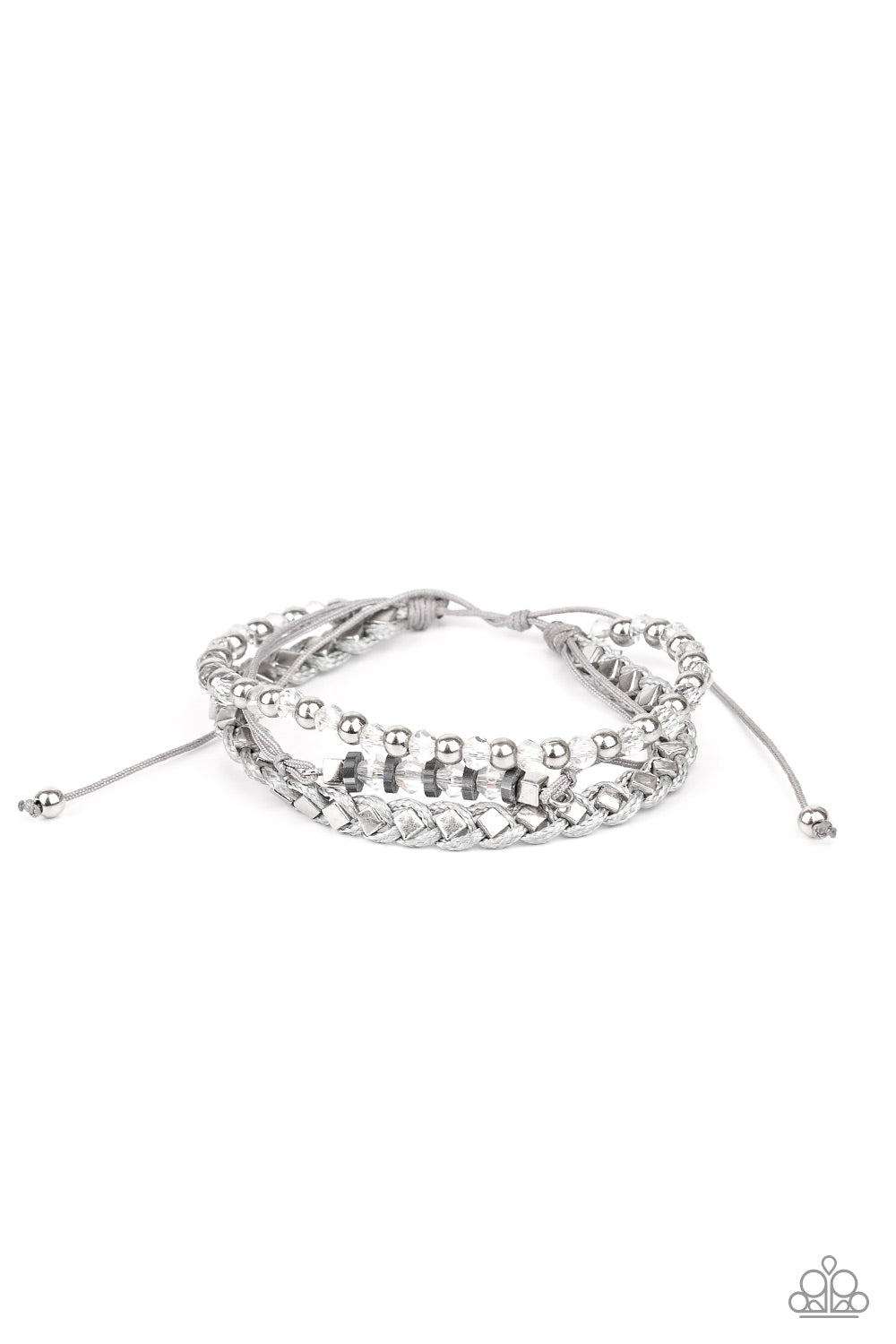 Infused with a strand of faceted white and classic silver beads, shiny gray cording knots around mismatched beads for an edgy look. Features an adjustable sliding knot closure.